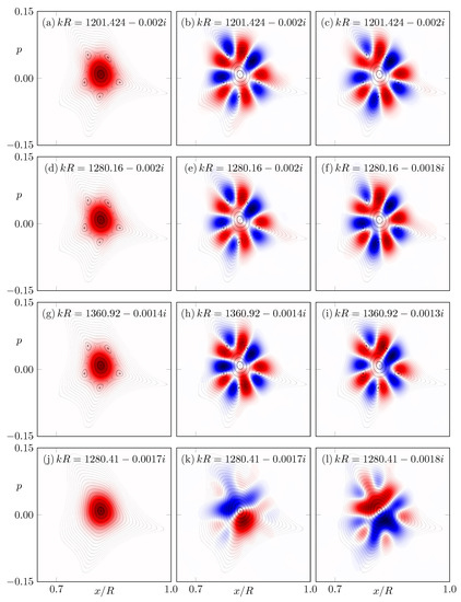 Note that in Equation (9), each Husimi function is normalized as discussed above. Hence, a preferred sense of rotation in the mode does not impact the difference . In Figure 10a–i, the Husimi function and the difference are shown for the long-lived modes in the microstar with a resonance chain. It is remarkable that over the range of , and , each mode and its partner mode with a quasi-degenerate frequency show almost the same pattern in . This pattern is organized around the stable and unstable fixed point of the resonance chain and in a very good agreement with the pattern of the FPO eigenstates, e.g., in Figure 5e.