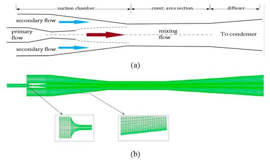 - Sriveerakul, T.; Aphornratana, S.; Chunnanond, K. Performance prediction of steam ejector using computational fluid dynamics: Part 2. Flow structure of a steam ejector influenced by operating pressures and geometries. Int. J. Therm. Sci. 2007, 46, 823–833. [Google Scholar] [CrossRef]