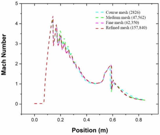 The model started with the mesh structure for the ejector flow domain. Intensive effort was given to the location predicted with high local speed to generate high-precision results. Figure 1 emphasizes the adaptive technology to highlight the specific structure of the grid. In this analysis, the grid was created with high quality and with a maximum aspect ratio of 0.9 and 5:1, respectively. These settings ensured an accurate result besides the converging of the solution. Figure 2 illustrates the distribution curve comparison of the Mach number at the centerline using various grid densities. The result revealed a similar trend by applying both the fine and medium grids in the simulations. Therefore, the medium grid model was selected for this study with 47,562 elements because it was independently verified, which contributes to improving computational efficiency.