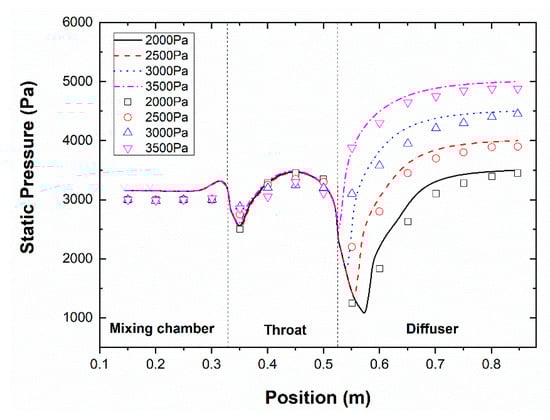 For the validation of the simulation result, the distribution of the static pressure along the ejector wall was used. The pressure values used in the comparison at the primary and the secondary flow streams were set at 0.34 MPa and 1.71 kPa, respectively, via different back pressure ranges.