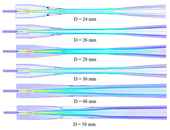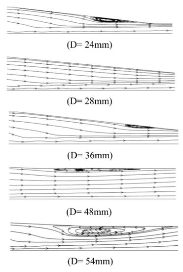 Moreover, the boundary layer separation degree witnessed a decrease when the diameter became larger than 48 mm. It also extended to the mixed section. Figure 5 indicates the magnified trace of boundary layer separation. The result demonstrated that the growth of the diameter values enhanced the vortex generated by the inverse pressure gradient, and consequently, the boundary layer separation was aggravated.