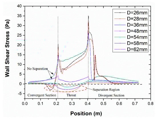The occurrence of boundary layer separation led to the compression of the flow passage of the secondary fluid. The mass flow rate of the primary fluid remained unchanged under the condition of fixed inlet primary stream conditions. Therefore, the entrainment ratio was reduced, and the ejector pumping efficiency decreased. As can be seen from Figure 5, when the mixing section diameter was less than 36 mm, the boundary layer separation existed in the “separation zone”. It is described as the area from the separation point in the mixing section to the reattachment point. However, once the diameter was greater than 48 mm, the situation was much more complicated than that when the diameter was less than 36 mm. In this diameter range, the “separation zone” of the boundary layer was located in the mixing chamber. The reattachment point was located in the equal area mixing section, while the “separation point” was located in the mixing chamber. When the primary fluid was ejected through the nozzle, the core of the primary fluid jet expanded continuously and formed a contractile structure in the mixing chamber.