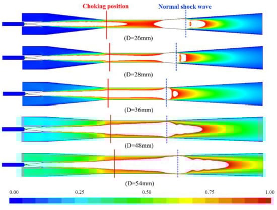 Figure 7 shows the Mach cloud diagram of the ejector at different mixing section diameters. To represent the structure of the primary fluid jet core, the figure only shows the flow field when the Mach value was greater than 1. When the diameter of the mixing section was less than, or equal to, 36 mm, the positive shock wave near the entrance of the diffusion section could avoid flow disturbance. This phenomenon was caused by the variation of back pressure when propagating upstream of the fluid. The back pressure change would not influence the flow channel shape in this case. The location of the choking fluid was still in the mixing section, holding the position of the secondary fluid effective area. At this time, the ejector was in critical working mode. Remarkably, the ejector was operating in double choking fluid mode. This is because the pressure near the wall upstream of the shock wave was uniform and rather small.