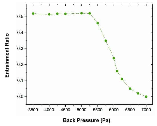 Figure 9 represents the influence of changing the back pressure on the entrainment ratio at primary and secondary pressure levels of 1710 Pa and 0.36 MPa via a mixing section diameter of 48 mm. The result revealed a high ejector entrainment ratio with a maximum value of 0.53 reached at a back pressure of 5300 Pa. However, at lower back pressure, the change in entrainment ratio was slight, and the value remained close to 0.53. On the other hand, having higher back pressure led the entrainment ratio value to drop sharply until the back pressure reached 7000 Pa. This indicated that the back pressure of 5300 Pa represented the ejector critical back pressure value under this operating condition. Once the back pressure was below 5300 Pa, the ejector was in a normal working state.