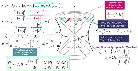 For the symplectic leaves, the transverse Poisson structure, which is endowed with its Poisson structure, will be taken into consideration in the second half of our discussion on the dissipative symplectic theory of heat and information. There are three different types of dissipation: thermal diffusion with energy conservation and entropy production through heat transfer; viscosity, which takes energy from the system (e.g., Navier–Stokes equation); and transport equations with collision operators. Hamiltonian dynamics describes systems that maintain energy throughout the phase. Dissipative effects, which are irreversible changes from a thermodynamic perspective, cannot be accounted for in classical Hamiltonian systems (dissipative dynamics that do not preserve energy). The metriplectic bracket was first introduced in 1983 by A. N. Kaufman [54] and P. J. Morrison [55,56,57], providing both conservation of energy and entropy production, and it reduces to the traditional Poisson bracket formalism in the limit of no dissipation. Parallel axiomatization of this model has been performed by Grmela [58,59] and Öttinger (with a method called GENERIC). Entropy in these models is assumed to be a Casimir function, as in the Souriau model. These types of systems that follow both the first principle and the Clausius second principle of thermodynamics are included in metriplectic dynamics.