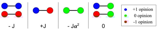 Contributions to the total energy for every possible pair of agents. Colors represent the individual opinion states. J is the coupling factor and the neutrality parameter.