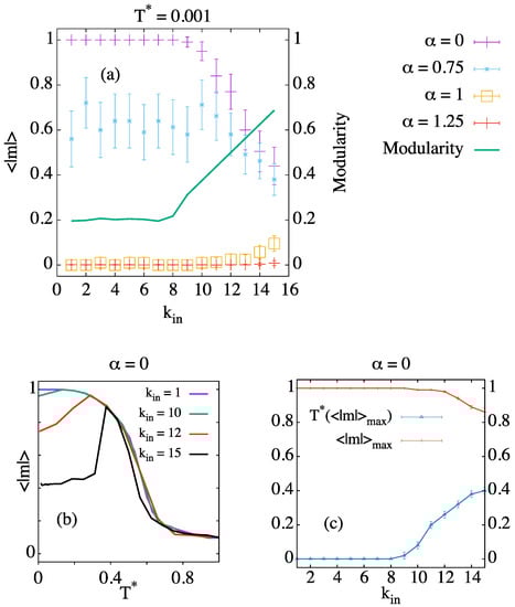 In Figure 2a, we can see the average of the absolute value of the magnetization as a function of the number of intra-community links at a very low temperature for different values of . The green line corresponds to the modularity of the best partition. There is a clear change in behavior around that can be understood by examining the probability of acceptance for a given flip proposal in the dynamics. In particular, if we consider two communities of agents, each holding +1 and −1 opinion, respectively, we have that, for , the probability of an agent in the positive community to change opinion to −1 (in two steps, i.e., passing through the neutral opinion) is equal to , where denotes the number of intra-community links. Therefore, when , we have .