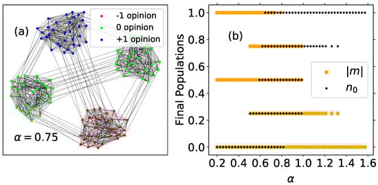 The case , with very well-defined communities in the limit of low temperatures, is examined in Figure 3. The left panel shows an example of a final configuration for this network at and . This is just one of the possible final outcomes for this network, in which magnetization and fraction of neutral agents turn out to be and , respectively. The right panel shows the possible final values for and for 30 MMC repetitions, starting from random initial conditions. These results show that the final configurations correspond to situations of consensus within communities but, in general, the system does not reach a global consensus. Notice that neutral communities do not have representation for ; therefore, in this range, the final is always 0, and the magnetization can take three possible values: