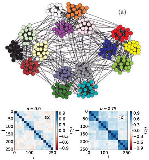(a) Representation of a two-level synthetic network formed by nodes. Colors are just here to visualize the community levels; (b) correlation values for every pair of nodes, obtained using ; (c) correlation values for every pair of nodes, obtained using . Results are obtained using 5000 MMC steps, and are averaged over 200 repetitions.