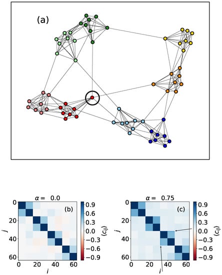 In Figure 4, we can see a network with two community levels generated as follows: a set of 256 nodes is divided into 16 clusters that will represent the first community level. The second organizational level of the network is formed by four compartments, each one containing four different clusters of the first level. Here, node colors do not represent opinions but are just to clarify the network topology. The results for show clearly the first level, corresponding to the smallest subgraphs that appear with correlation in 16 × 16 boxes in the main diagonal (Figure 4b) (We expect that, for , the results would resemble those obtained by using the Ising model). The second level is not so evident, but, when we use , we can distinguish it better, as the correlations within the four big compartments are stronger. This property, which is caused by the fact that a higher value of the neutrality parameter increases opinion diffusion, can also be used to detect asymmetries in the link distribution between nodes. For example, in Figure 5, we can see a network formed by four compartments which are in turn divided in two subgroups, but connections are not perfectly symmetric, unlike in the case shown in Figure 4. In particular, we can see one node, marked with a circle in Figure 5a that has more out-community links outside its compartment (on the second level of community structure) than the rest of the vertices. This feature is not visible when we perform simulations with , but it becomes noticeable when we use .