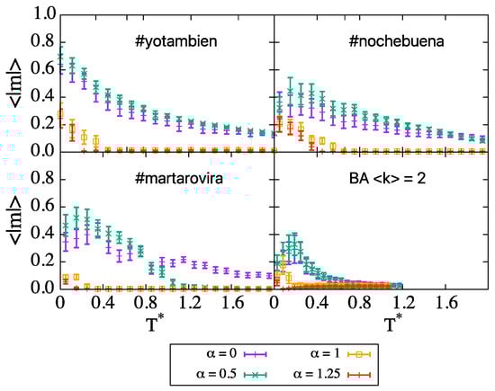 The networks #martarovira and #nochebuena exhibit a non-monotonic behavior of with T for . This is caused by the fact that the model presents a very complex energy landscape with multiple local minima when embedded in these topologies. This landscape is sensitive to the neutrality parameter , since it changes the energy difference between the local neutral consensus and local polarized consensus. When the temperature increases, some energetic barriers can be easily overcome, so the attractors of the dynamics change. In some cases, this can enhance the dominance of one polarized opinion over the other one, which corresponds to higher average absolute magnetization; in others, it is vice versa.