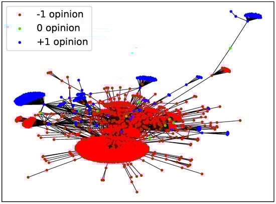 The voter model, which in some cases has a mapping to the Ising model, is another paradigmatic reference in opinion dynamics, again for binary opinion spaces [,]. The Potts model has also been applied to social physics in order to offer a broader opinion space which takes into account three or more opinions and can be more suitable for modeling non-polarized situations, in which a third state does not imply an intermediate opinion between two others [,].