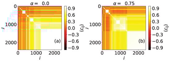In practice, what we do is to define a matrix whose elements account for the number of times the nodes i and j end up holding the same opinion in the simulation. We run a large number of simulations and normalize this correlation value as . As our Hamiltonian (1) only contains positive interactions between nodes (i.e., there is no repulsive term which drives neighbors to have different opinions at low temperatures), we expect a value for pairs of nodes which belong to different, well segregated communities.