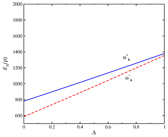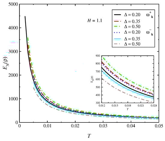 In Figure 2, we obtain the entanglement negativity as a function of T. We obtain a divergence of at due to large increases in the quantum fluctuations near ; therefore, there is a loss of quantum information at this limit. The behavior at the high T range is only qualitative due to the limitations of the spin-wave approach we used. The inset of the figure shows the variation with for two magnon bands: and . In Figure 3, we display the behavior of the entanglement negativity as a function of . We obtain that the entanglement negativity is finite at the XY limit (), where the terms of scattering between the quasiparticles given by the term are absent. We obtain an increase of with up to the isotropic limit . The behavior of the quantum correlations is determined by the behavior of energy bands that depend on the coupling parameters of the model, which generates a large effect on entanglement negativity. The mean-field ground-state solution of can be expanded as , where the results of this expansion are very near to the exact numerical method [48]. Consequently, the results of obtained with the spin-wave approach are near to the numerical results.