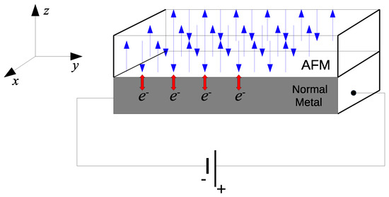 Bilayer structure consisting of an antiferromagnetic insulator on top of a normal metal of the model (Equation (15)). A voltage is applied to the normal metal in order to produce an electron current along the x axis.