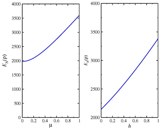 for the model (Equation (15)), as a function of h (right-side) for a value of coupling as , and for a value of held fixed (left-side).