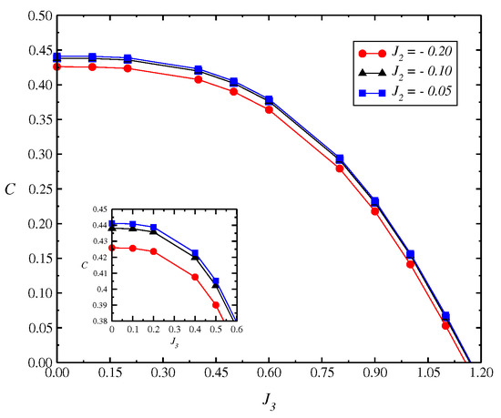 The calculations were performed for a lattice size of . We obtain a very small variation in the results with different lattice sizes . Furthermore, we obtain a strong influence in the strength of the bicubic term on concurrence with the extinction of C near to . Thus, the analysis by DMRG in Figure 6 seems to confirm decreases in the concurrence of C with the coupling .
