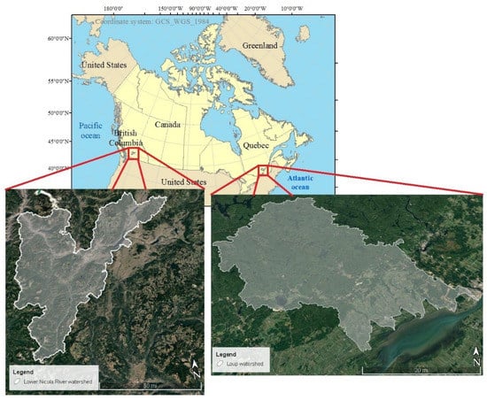 This study focuses on two watersheds, one in Quebec (QC) and the other in British Columbia (BC) provinces. On 3 May 2017, Eastern Canada was flooded due to heavy rain, with QC being the worst hit. The Loup watershed located in QC was one of the watersheds affected by the May 2017 flood. Likewise, the watershed of the Lower Nicola River, located in south-central BC province, was struck by a flood triggered by heavy rain on 14 November 2021. The location of both watersheds was depicted in Figure 1.