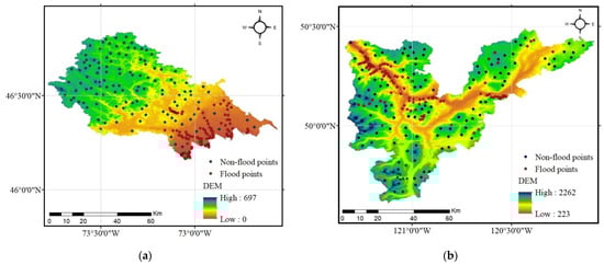 Flood inventory maps: (a) Loup watershed, and (b) Lower Nicola River watershed.