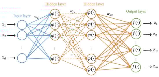 The neurons in two sequential layers are linked by the unknown weights whose values are estimated through the iterative back-propagation learning technique. The back-propagation approach is generally an iterative gradient-based learning technique (e.g., Stochastic Gradient Descent (SGD)) that aims to reduce the discrepancy between the outputs of the network and actual target values (i.e., reduce the value of the cost function) by estimating the weights in each iteration [76]. The architecture of an MLP-NN was shown in Figure 4. The connections of the nodes from different layers are made using Equations (6)–(8).