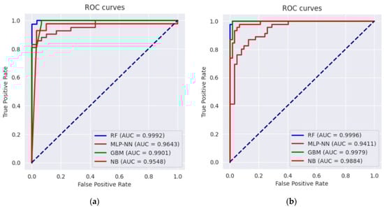 ROC curves along with the AUC values for each ML model: (a) the Loup watershed and (b) the Lower Nicola River watershed.
