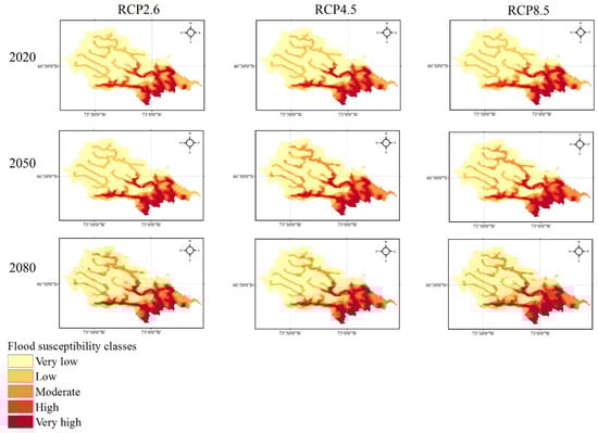 Providing the flood susceptibility maps and investigating the impacts of climate change on flood susceptibility of study areas throughout time were the primary objectives of this study. Accordingly, the flood susceptibility maps were mapped for both Loup (Figure 6) and Lower Nicola River (Figure 7) watersheds in the years 2020, 2050, and 2080 under three climate change scenarios of RCP2.6, RCP4.5, and RCP8.5. As briefly explained in Section 2.5, to provide flood susceptibility maps under climate change scenarios, the former precipitation layer was replaced with the intended climate change scenario precipitation layer; then, the intended precipitation layer was fed the ML model along with the rest flood explanatory factors. Finally, the resulted flood susceptibility values were stratified into five classes from very low to very high susceptibility using the natural break classification technique in ArcGIS 10.8 software. The area percentages of each flood susceptibility class given the year and climate change scenario were calculated for both the Loup watershed (Figure 8) and the Lower Nicola River watershed (Figure 9).