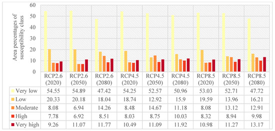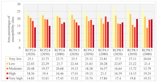 Area percentages of flood susceptibility classes under three climate change scenarios of RCP2.6, RCP4.5, and RCP8.5 in the Loup watershed.