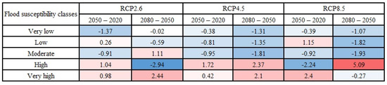 Changes (in %) in the area percentages of flood susceptibility classes based on the changes in the climate change scenarios in the Loup watershed.