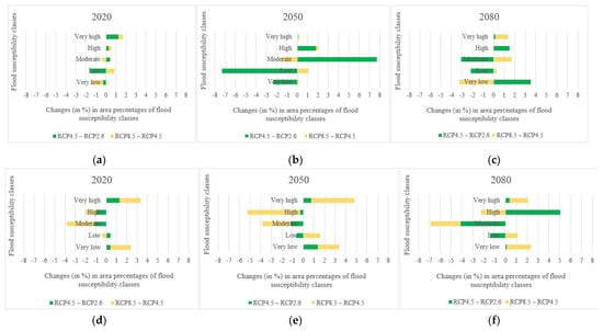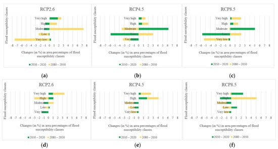 Changes (in %) in the area percentages of flood susceptibility classes over the years: (a) in the Loup watershed under scenario RCP2.6, (b) in the Loup watershed under scenario RCP4.5, (c) in the Loup watershed under scenario RCP8.5, (d) in the Lower Nicola River watershed under scenario RCP2.6, (e) in the Lower Nicola River watershed under scenario RCP4.5, (f) in the Lower Nicola River watershed under scenario RCP8.5.