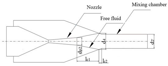 The determination of the nozzle exit position mainly affects the expansion of motive fluid and then affects the mixing of two streams of fluid, which is considered to be an ideal value when the final section area of the primary fluid free flow beam coming out of the nozzle is equal to the mixing chamber inlet area. As a result, the free flow beam length of the motive fluid () and the diameter of the free flow beam at this position () are two critical parameters in determining the nozzle exit position. Figure 3 is the diagram of the free flow beam of the motive fluid.