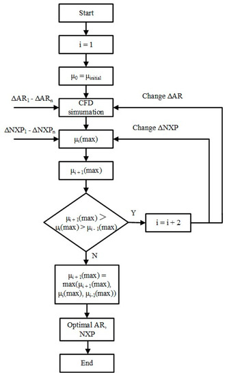 We have to admit that the initial design cannot satisfy the optimal ejector performance because neither the theoretical nor the numerical simulation methods can accurately describe the fluid flow characteristics. Therefore, the structural optimization is an essential step in improving ejector performance for ejector design. This paper optimizes the ejector area ratio (AR) and nozzle exit position (NXP), which are two critical parameters related to fluid mixing and primary flow expansion, and finally obtains the optimal ejector performance. To ensure that the results are unaffected by other parameters, the simulation is carried out with fixed operation temperatures and geometry parameters, which are the same as the initial designed parameters. The control variable optimization algorithm is used to optimize the structural parameters in order to obtain optimum ejector performance, because these two geometrical parameters are coupled. Figure 4 shows the detailed optimization process.