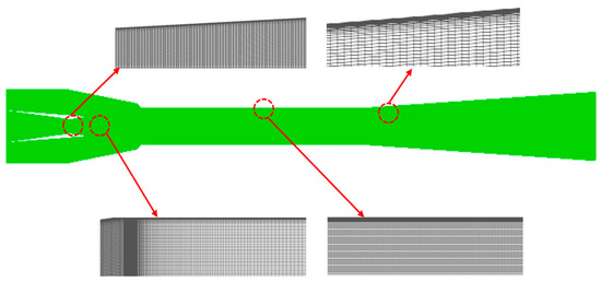 The turbulent model is used to close the fluid flow equations in the Reynolds-Averaged Navier–Stokes (RANS) numerical simulation methods, and the two-equation model is more widely used in engineering computation due to it being more theoretical when dealing with complex flow processes. Moreover, the prediction accuracy about fluid characteristics is higher for the model because it neglects the nonlinear attenuation function that is presented in the model. Giorgio et al. [34] reported that the SST shows the best results for fluid flow quantities inside the ejector compared with the RNG model, so this paper adopts the SST turbulent model to solve the fluid governing equations.