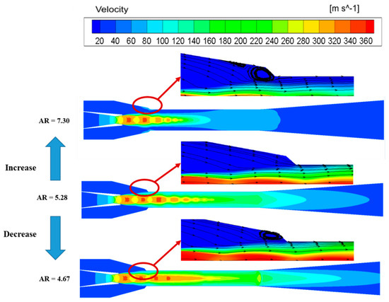 The flow field distribution inside the ejector under different ARs.