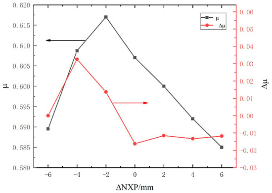 Figure 9 depicts the influences of NXP on the entrainment ratio. It should be pointed out that the ΔNXP is positive when the NXP increases, and it becomes negative when the NXP decreases. It can be concluded that the entrainment ratio increases initially and then decreases with the increase in NXP. The entrainment ratio decreases almost linearly with the increase in NXP when ΔNXP is positive, with a reduction rate of 1%. This means that an improper NXP will cause the rapid deterioration of the ejector performance. In addition, the entrainment ratio growth rate is positive when the ΔNXP is negative, and further increasing ΔNXP makes it becomes negative. As a result, the ejector has the best performance when ΔNXP = −2, with the maximum entrainment ratio having a maximum of 0.617. The improvement of the entrainment ratio is about 17.34% compared with the initial value.