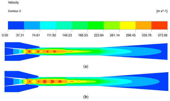 Figure 11 indicates the velocity distribution under different NXPs. It can be seen that the velocity core of the primary fluid for ΔNXP = −2 mm is smaller than that for ΔNXP = −6 mm in the mixing chamber, which means that the velocity core increases with the decrease in NXP. When the NXP is less than the optimal value, the final section area of the motive fluid is smaller than that of the mixing chamber inlet, indicating that the motive fluid is under-expanded. As a result, the short NXP makes a smaller pressure difference between the primary and secondary fluid, causing a decrease in the secondary fluid mass flow rate. Moreover, the motive fluid continues to expand in the mixing chamber, resulting in a higher velocity core. At the same time, there is great irreversible loss inside the ejector due to the cyclic process of expansion–compression–expansion, resulting in the deterioration of the ejector performance. The velocity core decreases with the further increase in NXP, and the ejector has the best performance until the occurrence of an appropriate velocity core. In conclusion, the NXP mainly affects the primary fluid expansion—the motive fluid is over-expanded when it is longer than optimal; otherwise, the motive fluid is under-expanded.