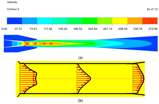 The velocity distribution inside the ejector. (a) The velocity contours inside the ejector. (b) The velocity vector inside the mixing chamber.