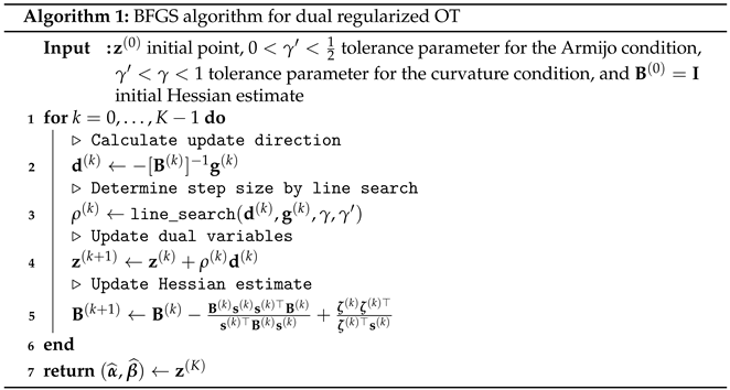 - Blondel, M.; Seguy, V.; Rolet, A. Smooth and sparse optimal transport. In Proceedings of the 21st International Conference on Artificial Intelligence and Statistics, Canary Islands, Spain, 9–11 April 2018; PMLR. pp. 880–889. [Google Scholar]