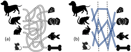 For formal analysis of the travel maze problem, we need to represent the paths on a discrete retina of S-elements (Figure 1). Then, to implement the logic of the proof of Rosenblatt’s first theorem, each A-element should be an indicator element for a possible path. For each guest-delicacy pair in Figure 2a or Figure 2b, an elementary perceptron must be created that returns 1 if there is a path from this guest to this delicacy, and 0 if there are no such paths. Thus, elementary perceptrons should be created. We can easily combine them in a shallow network with outputs. To finalize the formal statement, we should specify the set of the possible paths. In our work, we select a very simple specification without loops, steps back or non-transversal intersections of paths (Figure 2b).