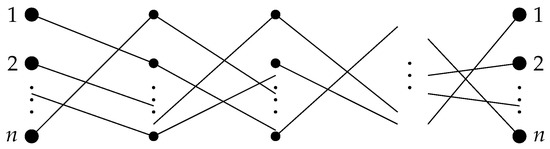 Consider the following problem. There are n people, each of whom owns a single object from the set and different people that own different objects. This correspondence between people and objects can be drawn as a diagram consisting of n broken lines, each of which contains L links (Figure 3). Each stage of the diagram consists of n links and can be encoded by a permutation or, equivalently, by a permutation matrix in a natural way. Namely, if an edge is drawn from node i to node then the permutation can be represented in the form