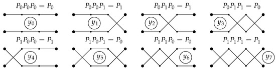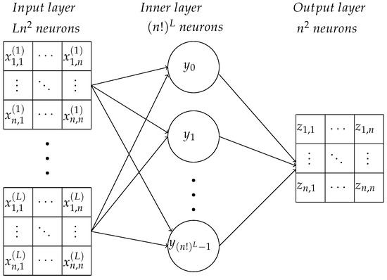 Entries of matrices are inputs of the neural network (see Figure 4). Each input corresponds to an input neuron (S-element, Figure 1). An inner layer A-neuron corresponds to the L-tuple having the same number j. The neuron should give the output signal 1 if the input vector is and output 0 for all other possible input vectors. Other input vectors are impossible in our settings (Figure 4). Each matrix element of every permutation matrix is either 0 or 1; therefore, the L-tuples star of output connections of the inner neuron can be coded as a 0–1 sequence, that is a vertex of the -dimensional unit cube. (Apparently, there are more vertices than L-tuples of permutation matrices). This cube is a convex body, and each vertex can be separated from all other vertices by a linear functional. In particular, for each j, we can find a linear functional such that and (, ). Here we, with some abuse of language, use the same notation for the tuple and the correspondent vertex of the cube (a 0–1 sequence of the length ). Thus, each inner neuron can be chosen in the form of the linear threshold element with the output signal (compare to (1) and Theorem 1):