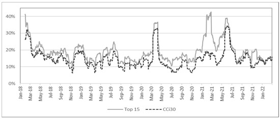 Figure 1 shows the annualized 30-day rolling standard deviation of the top 15 cryptocurrencies and the value-weighted CCi30 index.