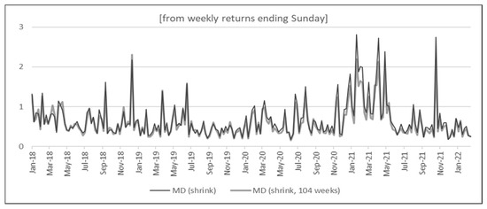 Section 4, the empirical results compare MD when mean and covariance are estimated from either the entire period (i.e., finding distance relative to the overall movement) or the most recent 104 weeks (i.e., finding distance relative to the market condition during the most recent two years, since March 2000).