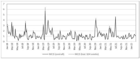 Figure 3 shows anomaly scores when mean and covariance are estimated from the entire period (from January 2018 to February 2022) or from only the last 104 weeks (from March 2000 to February 2020).