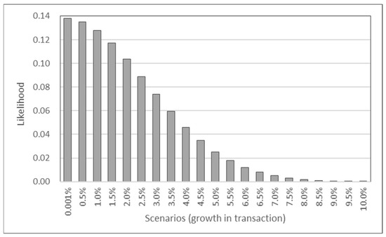 Figure 7 plots the likelihood for the 11 scenarios in this example. The probability of growth in weekly transaction being at least 6% is less than 5%. Thus, even though scenarios are included for cases with large transaction growth, incorporating likelihood through anomaly scores controls the influence on future outcome that are considered outliers. Finally, based on the scenario analysis of traditional assets proposed by [