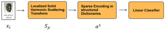 However, unlike atoms’ orbital positional distributions, a raw face point cloud yields a coarse underlying smooth surface but behaves with non-guaranteed differentiability. The Euclidean learning methods would probably fail to converge. The authors of [22] proposed an approach for the overlap of multiple smoothed position signals, allowing for the representation of periodic structures. The idea of combining a scattering transform approach with a deep network has also been developed [23,24]; additionally, a recent attempt at solving complicated classification problems with scattering representation achieved a remarkably fast-converging performance with potential in mathematical analytic implementations [9]. Furthermore, their work relies on a classical, active technology—sparse dictionary learning [25]. We utilized this idea to select discriminative signal components to prevent our model from regressing to a representation of irrelevant deformations.