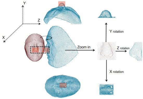The rigid rotation caused by pose variations; this figure merely gives several discretized realizations. The point subsets in blue indicate the rotated version of the original local areas around the nose tip.