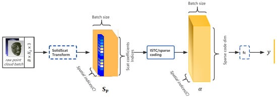 where it encloses a solution with a forward step by computing a reconstructed and a backward step by putting it back into the proximal projection operator, updating and D. Since our aim was to implement an efficient classification model, the sparse code should be able to preserve the principle components of the input signal; additionally, with the experimental observation of the point cloud faces’ solid scattering coefficients, we saw most energy being carried by its rare lower-frequency components and characterized by larger-magnitude coefficients; therefore, we picked the recent generalized ISTC algorithm [9], which adopts an auxiliary dictionary to accelerate convergence. Here, the ReLU function acts as a positive soft thresholding implementation of proximal projection. Then, the optimization can be reached in an unsupervised -iteration-updating scheme, expressed as follows: