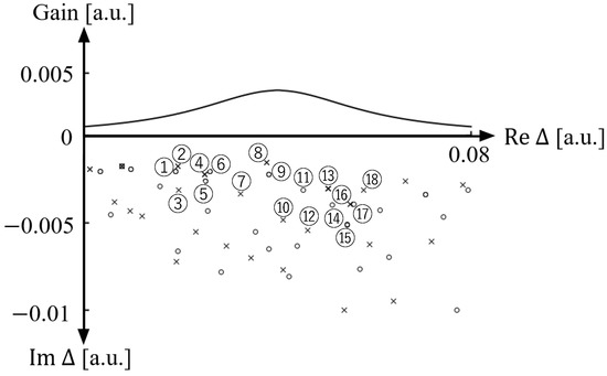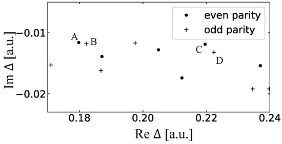 Figure 2 shows the distribution of the resonances of the cardioid optical billiard numerically obtained by the boundary element method [47] and the gain function for the SB model defined by . The shape of a cardioid optical billiard is defined as in the 2D polar coordinates with R = 30 in our numerical simulations as shown in Figure 1. Due to the symmetry of the cardioid billiard, the resonances are classified into two different classes of even and odd parities. The refractive index is 3.3 inside the billiard and outside the billiard. The other parameters are set as follows: , , , , , and . From Figure 2, one can see that there exist a number of resonances with low decay rates (i.e., ).