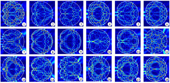 It has been theoretically shown that in a fully chaotic billiard laser, at least one single-mode lasing state is stable, whereas all multi-mode lasing states are unstable, when the external pumping power is sufficiently large and the billiard size is much larger than the wavelength so that holds, where is the difference between adjacent lasing frequencies [33]. This result provides a theoretical ground for recent experimental observations of universal single-mode lasing in fully chaotic billiard lasers [28,32]. We emphasize that the cardioid billiard laser numerically studied in this paper is much larger than those billiard lasers which have been studied so far. In addition, the gain band is much wider than those of previous studies. Therefore, the simulation condition shown in Figure 2 is more appropriate to numerically verify the universal single-mode lasing of fully chaotic billiard lasers. Figure 3 shows the spatial patterns of the resonance wave functions corresponding to the resonances labeled in Figure 2. All of these low-loss wave functions are distributed over the billiard domain and significantly overlap with one another reflecting fully chaotic ray-dynamical trajectories in the cardioid billiard [31,32,33,48].