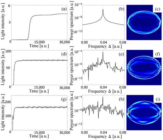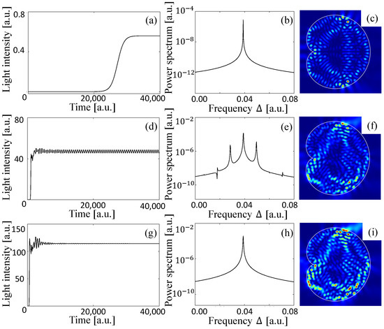 Typical examples of the time evolution of the total light intensity inside the cardioid billiard laser are shown in Figure 4a,d,g. The longitudinal relaxation rate is set to 0.01, which is much larger than the frequency differences of adjacent resonances, i.e., (see also Figure 2). The lasing threshold is found to be 0.000866. When the pumping power is 0.001 just above the threshold, the intensity converges to a certain constant after initial transient behavior as shown in Figure 4a. The power spectrum is obtained by the Fourier transformation of the time series in the stationary lasing regime in Figure 4a and has a single peak as shown in Figure 4b, which means that the stationary lasing state includes only one lasing mode. The spatial intensity pattern of this stationary single-mode lasing state is shown in Figure 4c. One can see that this intensity pattern is almost the same as that of the resonance wave function labeled by ➇ in Figure 3.